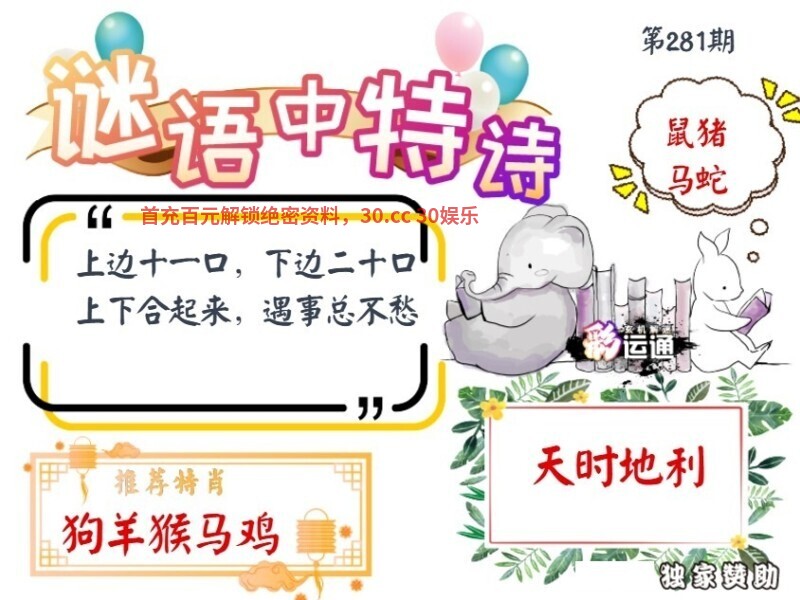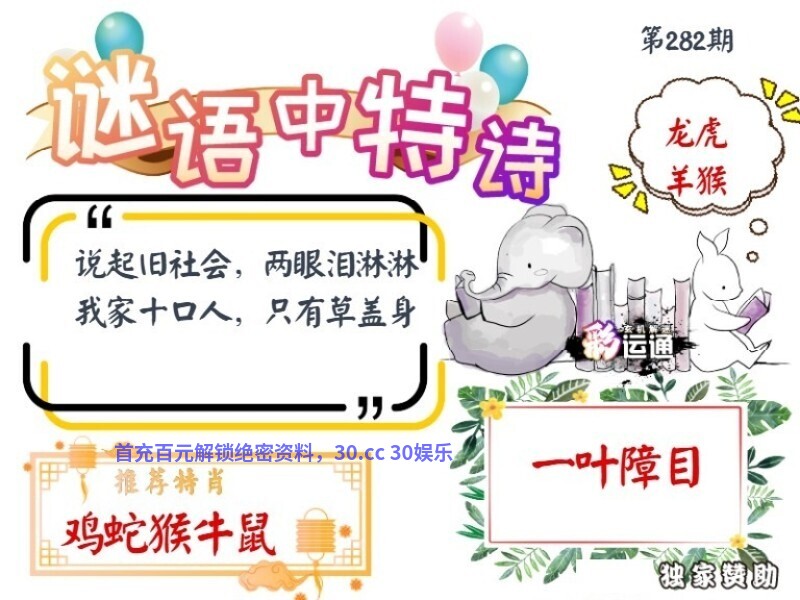 282期谜语中特诗:【一叶障目】 说起旧社会,两眼泪淋淋 我家十口人,只有草盖身 解:我家十口人解家禽生肖牛猪狗鸡羊马 五肖:牛猪狗鸡羊 四肖:牛猪狗鸡 三肖:牛猪狗 二肖:牛猪 一肖:牛 |